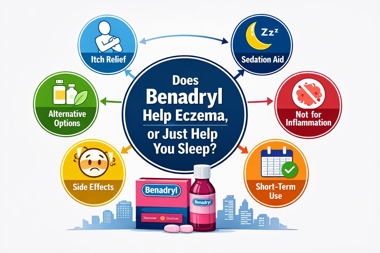 Eczema itching is real, exhausting, and often worse at night. Benadryl can sometimes help by making it easier to sleep and reducing awareness of itch, but it typically does not treat the underlying skin inflammation that drives eczema flares. If you are asking does benadryl help eczema, the most practical approach is to treat Benadryl as a short-term, situation-specific tool rather than a main treatment plan. Start with consistent moisturizing, gentle skin care, and appropriate anti-inflammatory therapy for flares, then add itch-control strategies like cold compresses and nail management. If nighttime itching persists, consider discussing safer, longer-term options with a clinician.
