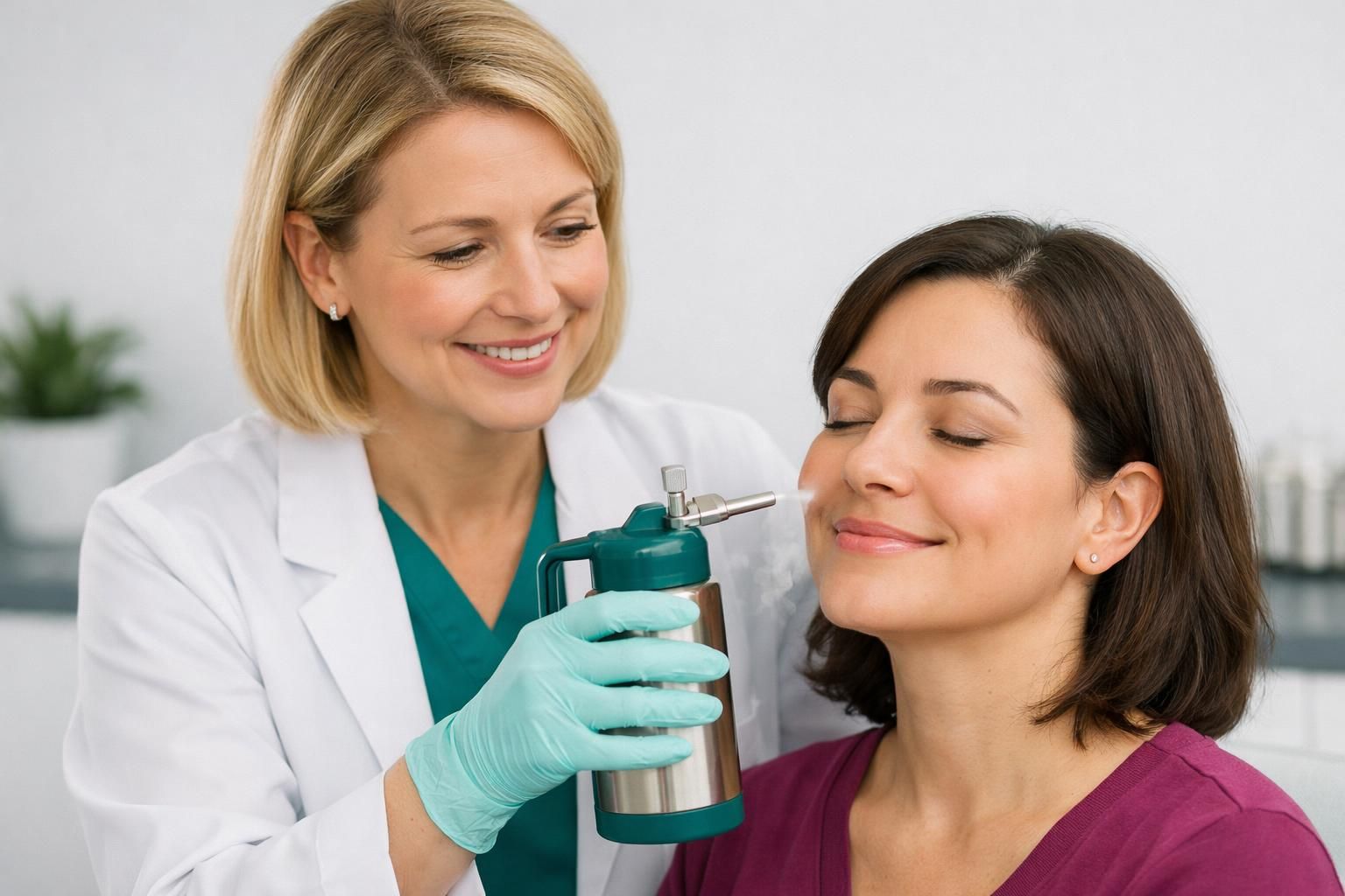 In dermatology, cryotherapy usually means applying liquid nitrogen with a spray device or a cotton-tipped applicator. The clinician performs a controlled freeze, sometimes once and sometimes in a freeze-thaw cycle depending on the lesion.