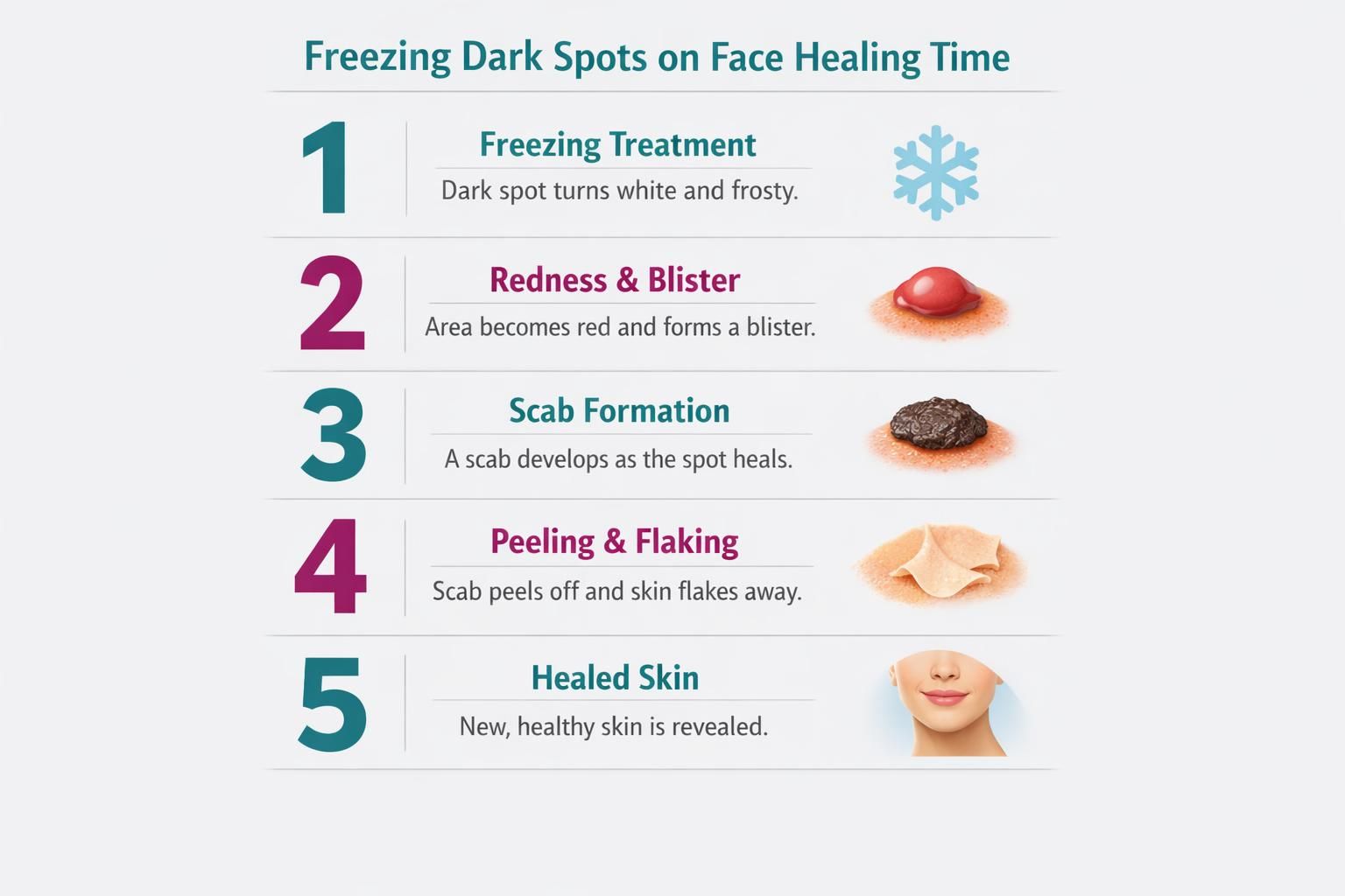Freezing dark spots on face healing time is important to plan for because the face is highly visible and often shows redness or crusting during recovery. Many people return to normal activities right away, but may prefer to schedule treatment when a few visible days are acceptable.