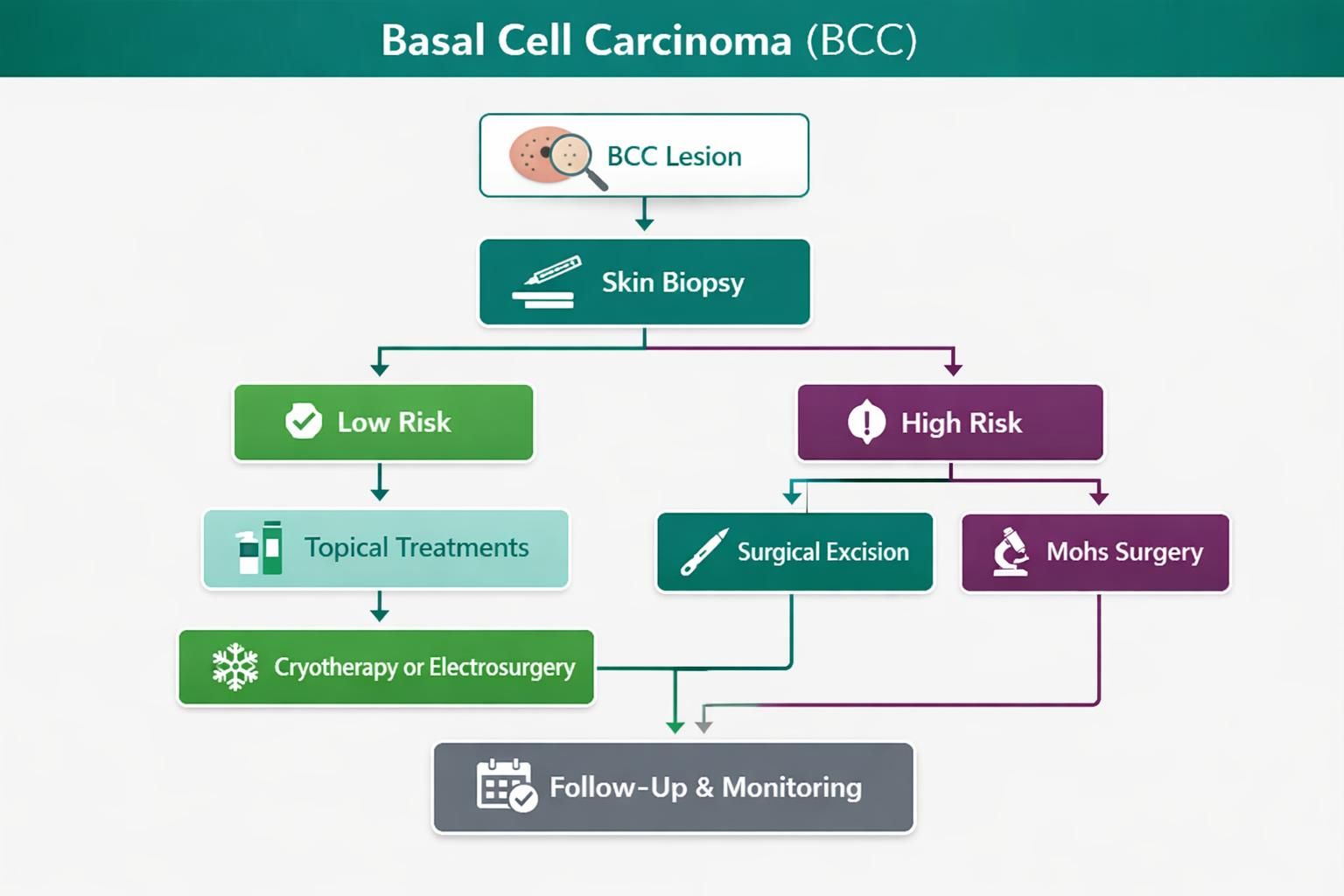 Many BCC and SCC lesions are treated with procedures designed for complete removal, such as surgical excision or specialized techniques for high-risk areas like the face. Some superficial lesions may be treated with surface-directed approaches when appropriate for the tumor’s features.